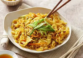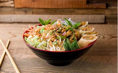 Vermicelles de riz, sucrine, carottes râpées, pousses de soja, nems au poulet, cacahuètes, menthe, sauce Thaï